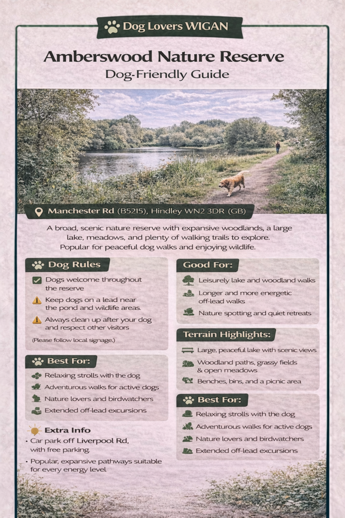 Amberswood Nature Reserve is one of the largest and most diverse green spaces in the Wigan borough — a mix of woodland, wetlands, lakes, and meadows that has been transformed from former mining land into a thriving wildlife habitat.