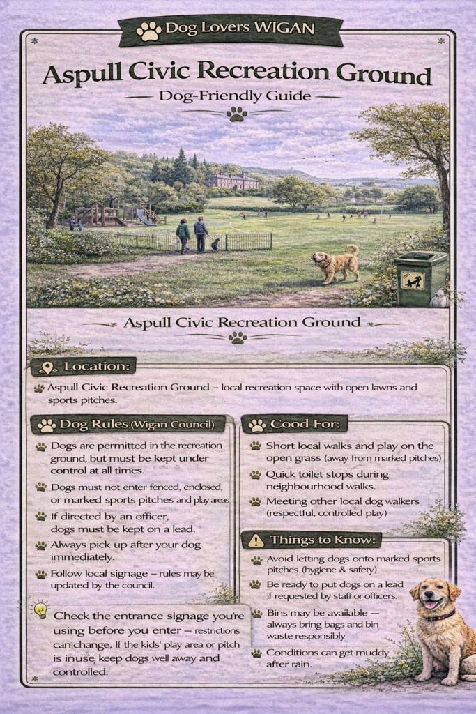 Aspull Civic Recreation Ground is a well-used community park located in Aspull, Wigan (Greater Manchester). Known locally as “The Rec,” it offers a mix of open green space, sports facilities, and family-friendly features, making it a popular spot for residents and dog walkers alike.
