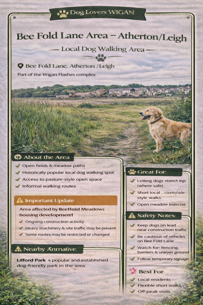 Bee Fold Meadows is a peaceful local green space in Leigh (Wigan Borough), offering a mix of wildflower meadows, wetland areas, and natural walking routes. It’s a quieter alternative to larger parks, making it ideal for relaxed walks, dog owners, and nature lovers.