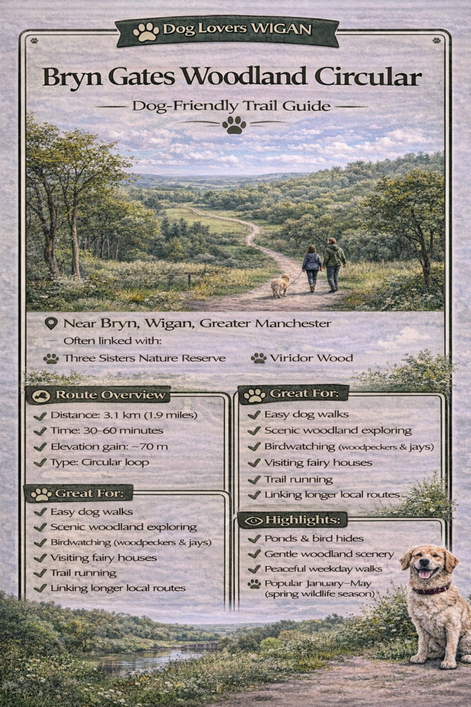 Bryn Gates Circular Walk is a peaceful and scenic walking route located between Bryn, Ashton-in-Makerfield, and Abram (Wigan Borough). The route loops through a mix of woodland, open fields, and reclaimed green space, making it a popular choice for walkers and dog owners looking for a quieter alternative to busier parks.