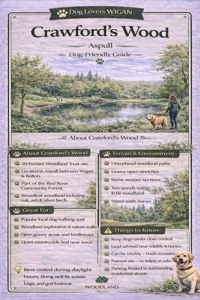 Crawford Wood is a quiet woodland area located on the edge of Aspull, close to Haigh Woodland Park. Itβs a lesser-known but highly valued spot for peaceful walks, dog walking, and nature exploration.