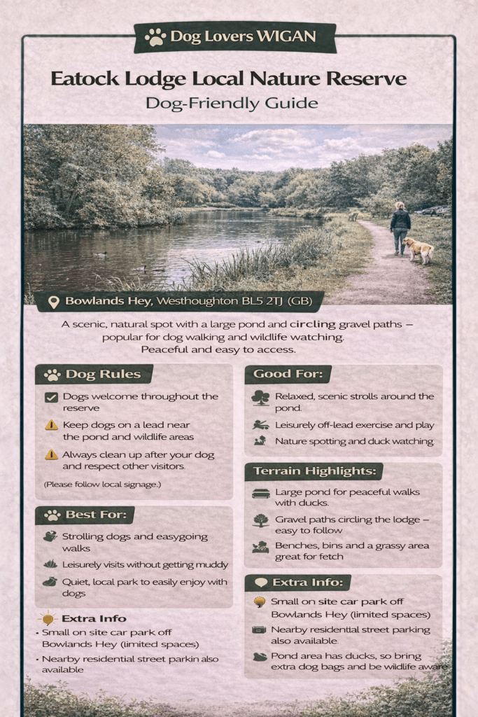 Eatock Lodge is a quiet countryside area on the edge of Westhoughton, close to the Wigan borough. Known for its woodland trails, open fields, and peaceful surroundings, it’s a popular spot for dog walkers, runners, and locals looking for quieter outdoor space.