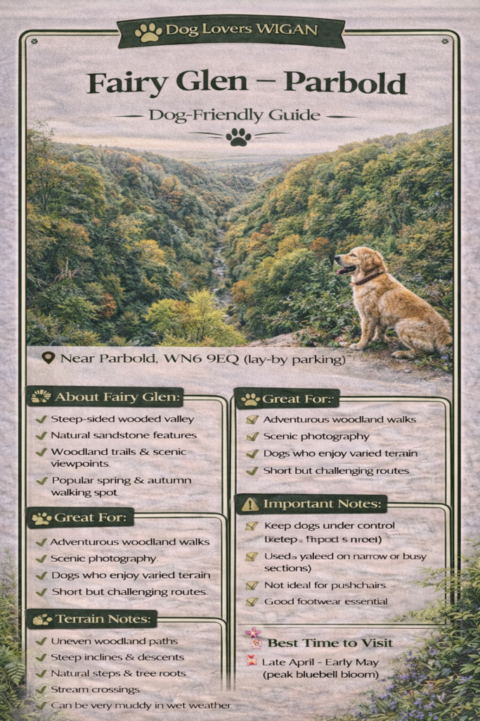 Fairy Glen is one of the most beautiful and unique natural areas in Wigan, known for its woodland gorge, flowing streams, rocky outcrops, and magical scenery. Located near Appley Bridge, it’s a favourite for walkers, photographers, and dog owners looking for a more adventurous setting.