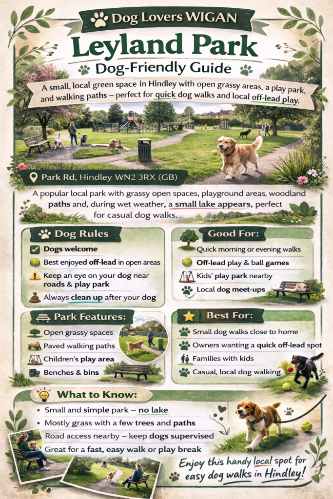 Leyland Park is a popular dog walking spot in Hindley, especially for quick daily walks.