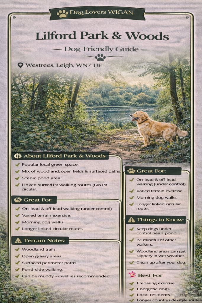Lilford Woods is a scenic woodland area forming part of Lilford Park, one of Leigh’s most historic and well-loved green spaces. It offers a mix of ancient woodland, open parkland, and walking routes, making it a popular spot for dog walking, hiking, and nature visits.